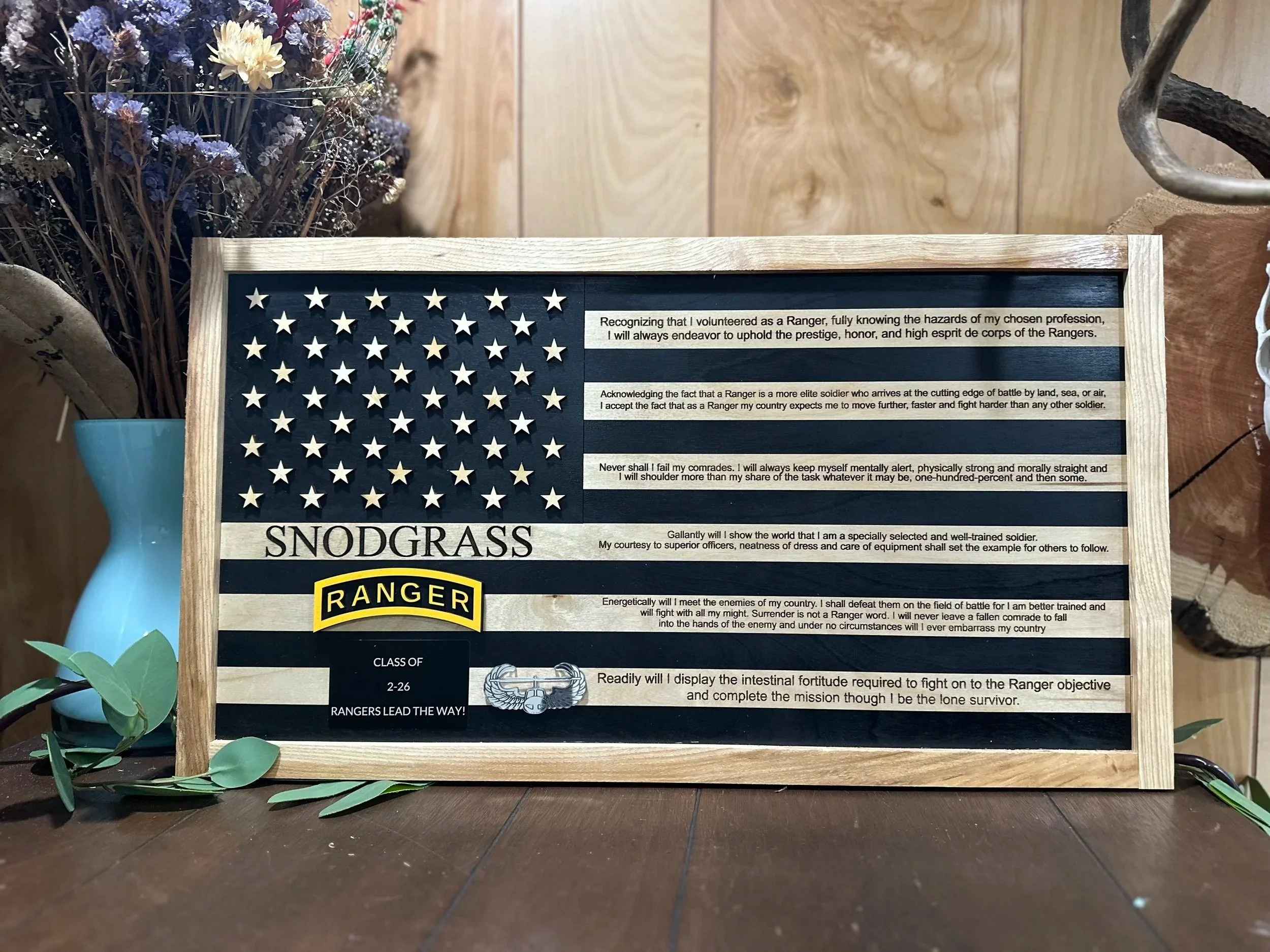 To go “62 and through” means your Ranger successfully completed all three demanding phases—Darby, Mountain, and Swamp—on their first attempt, without recycling. Replacing the wooden Ranger Tab emblem with a Golden Ranger Tab engraved with “62 & Through” subtly integrated into the flag design to showcase it in a meaningful yet understated way.